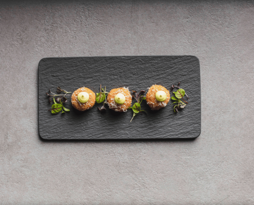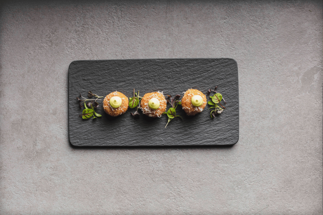 Sweet Potato Croquettes, Lemon & Turmeric Aioli, Wild Herb Salad & Orange Dressing