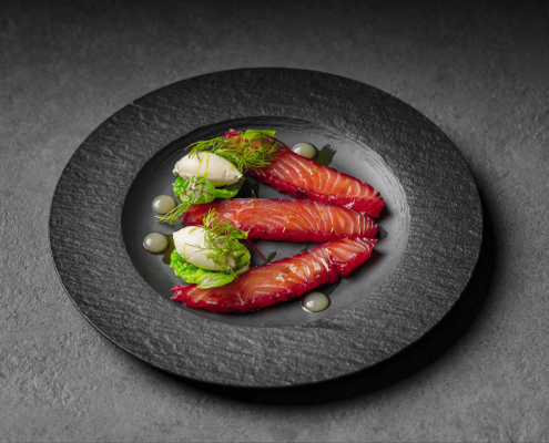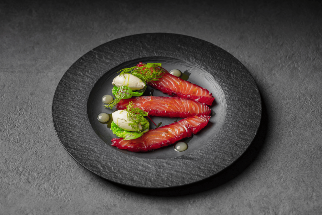 Blueberry Cured Salmon, Lemon Curd Cream, Buttered Savoy & Dill Oil